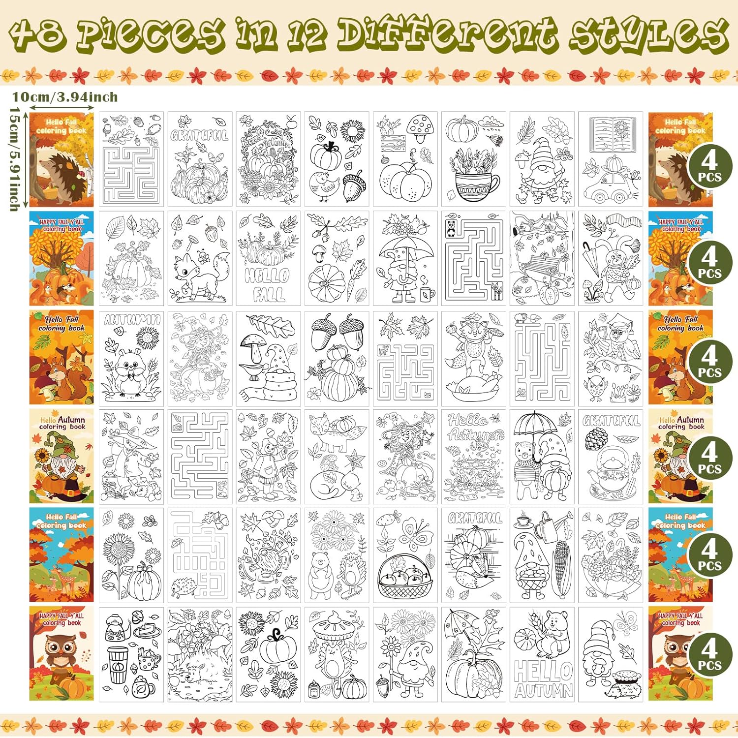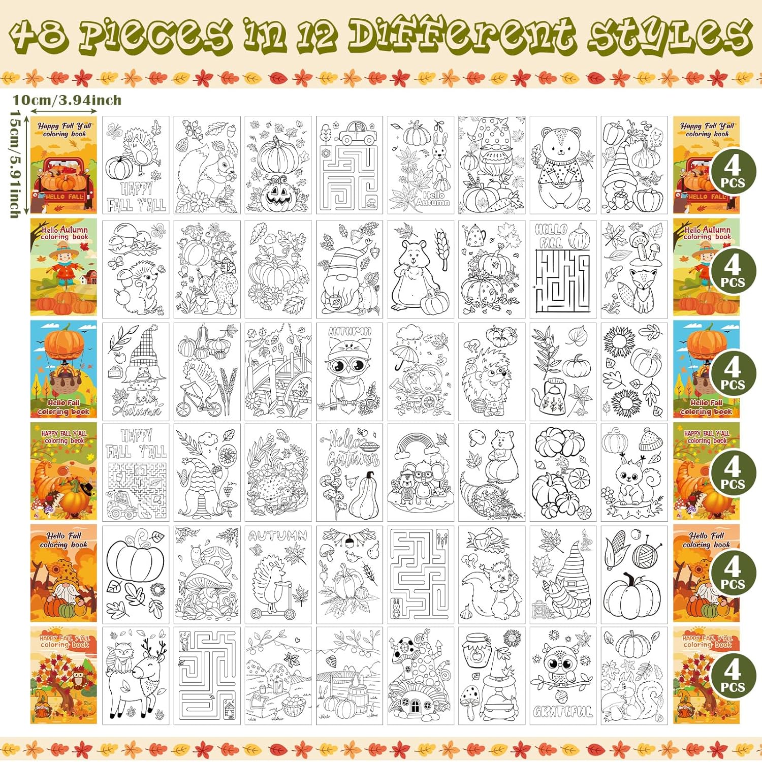 These 48 Thanksgiving mini coloring books are a joyful way to spark creativity and bring warmth to any gathering. With 12 unique styles and 4 copies of each, each book delivers 8 pages packed with 96 individual designs, perfect for endless hours of fun. Whether itâs for family time, classroom activities, or as a special party favor, these books are designed to make every moment meaningful and memorable.