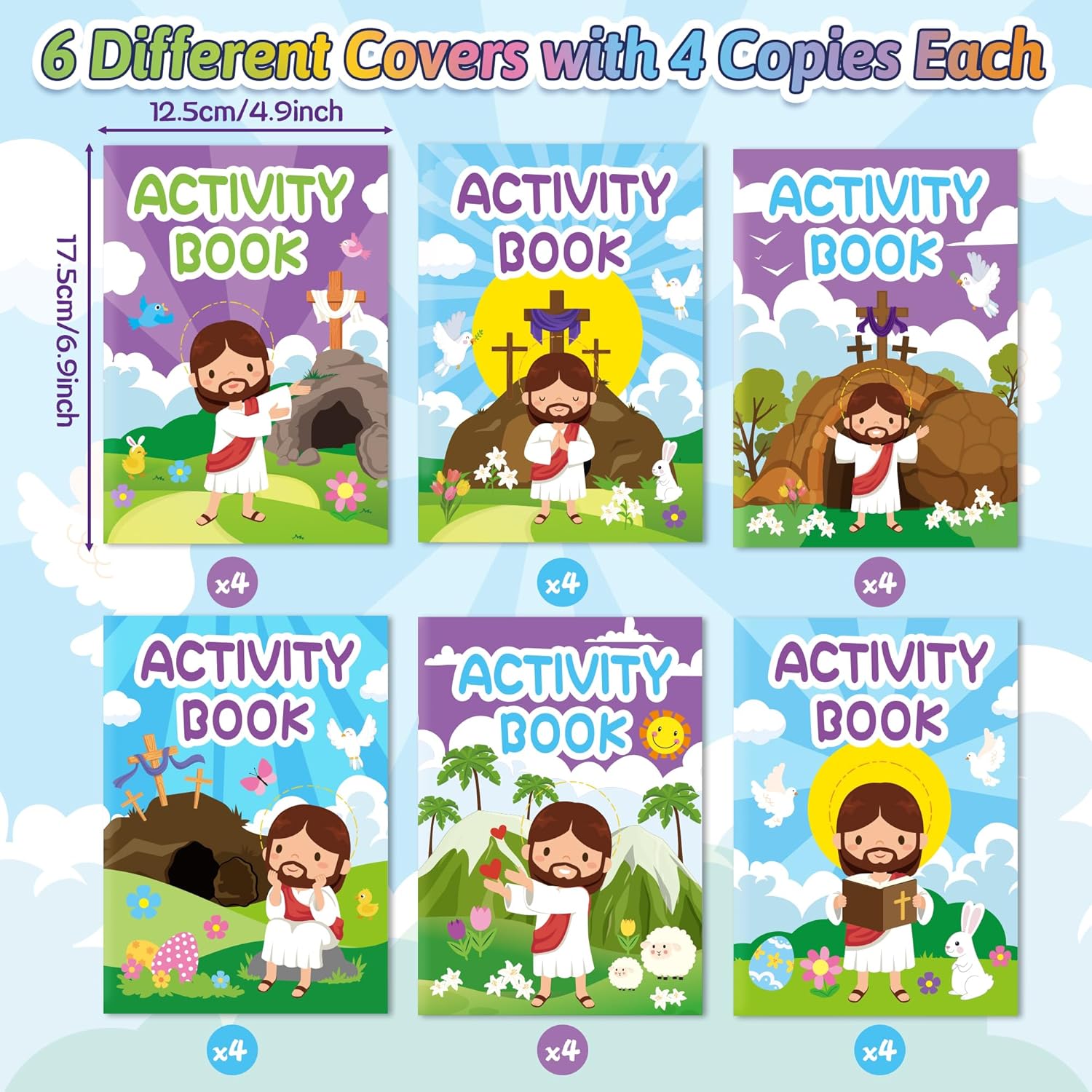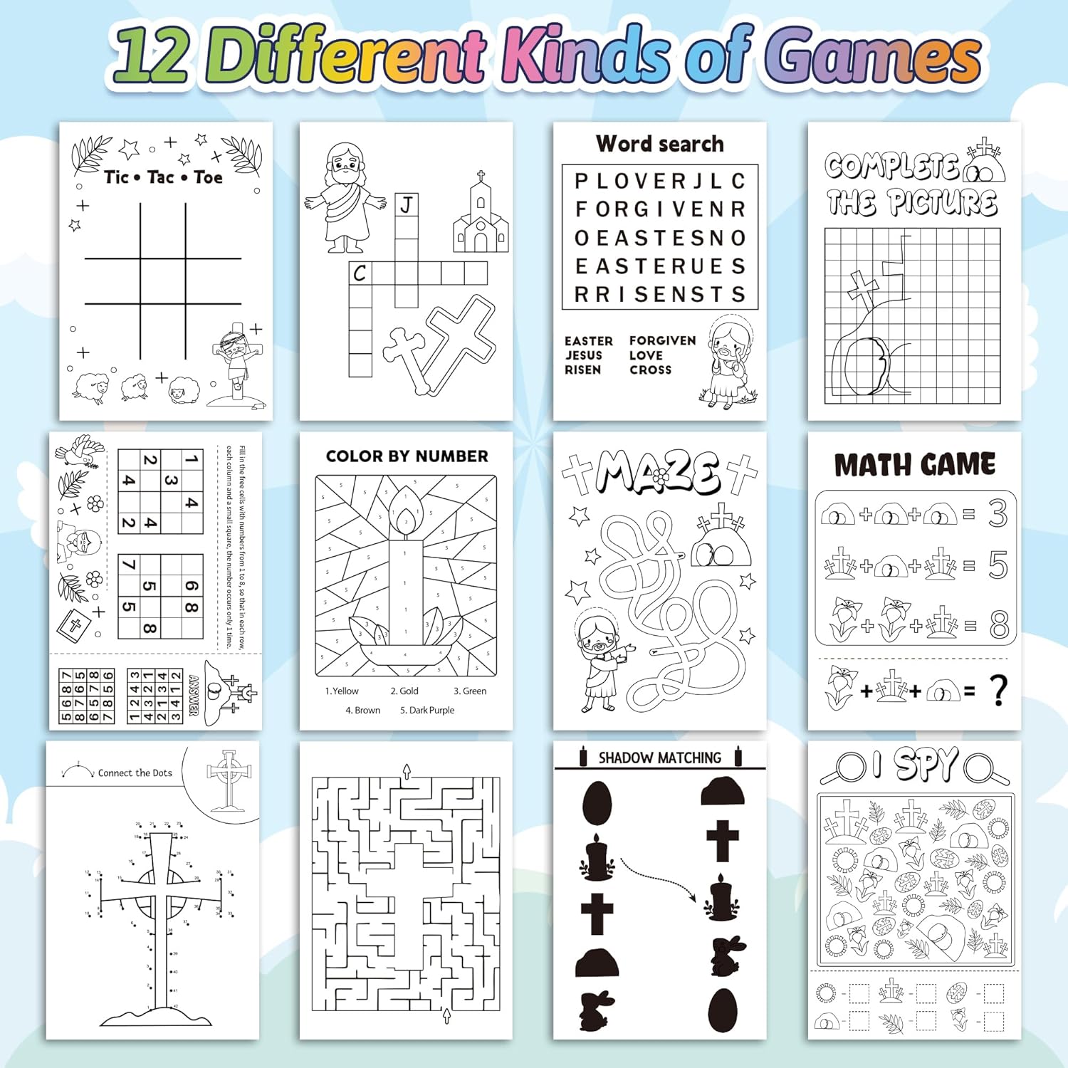 The 24-piece Easter activity book set is designed to entertain and educate kids throughout the Easter season. Featuring a wide range of activities including coloring pages, mazes, word search puzzles, word scrambles, and find-the-difference games, this set ensures hours of enjoyable learning. The 'He is Risen' theme brings a heartfelt message to every activity, making it a meaningful gift that combines religion with creativity through stunning illustrations.