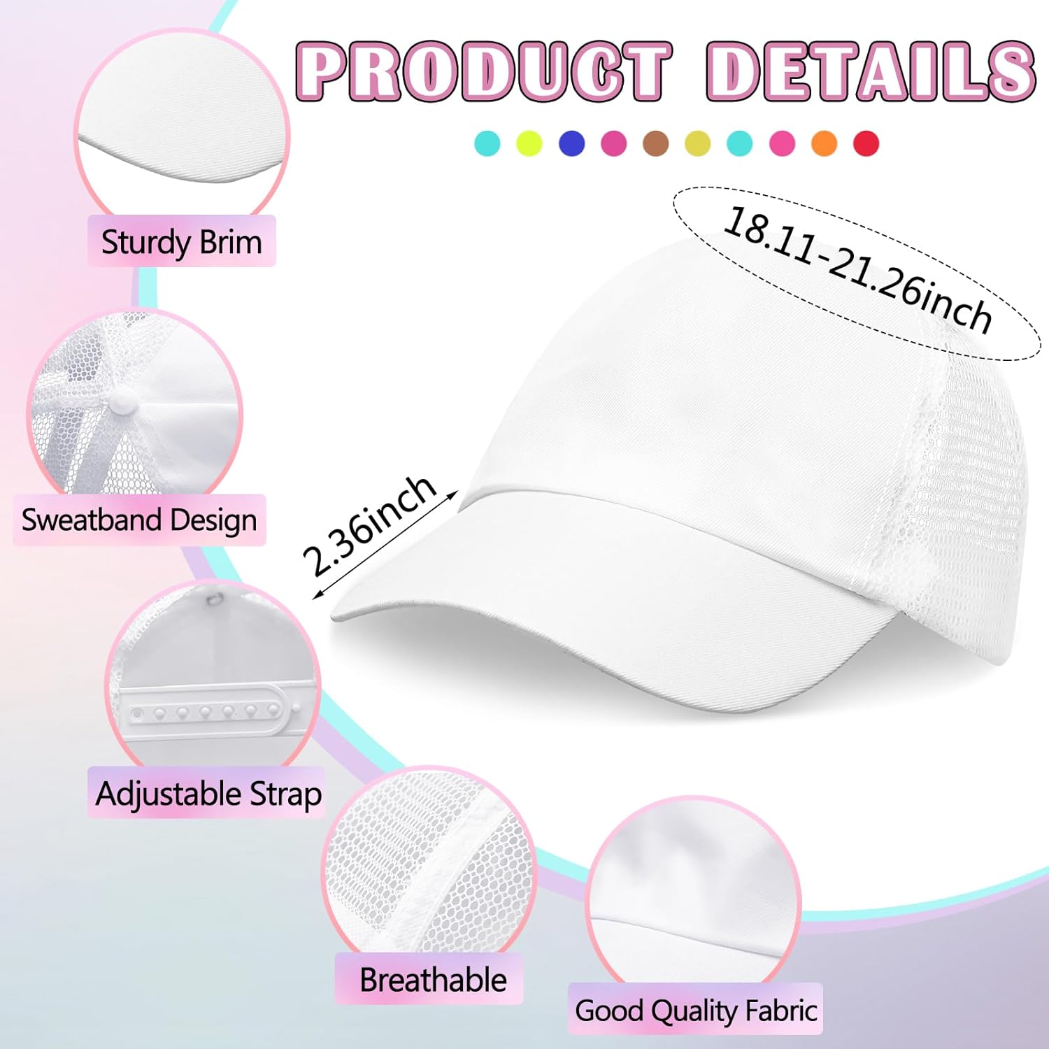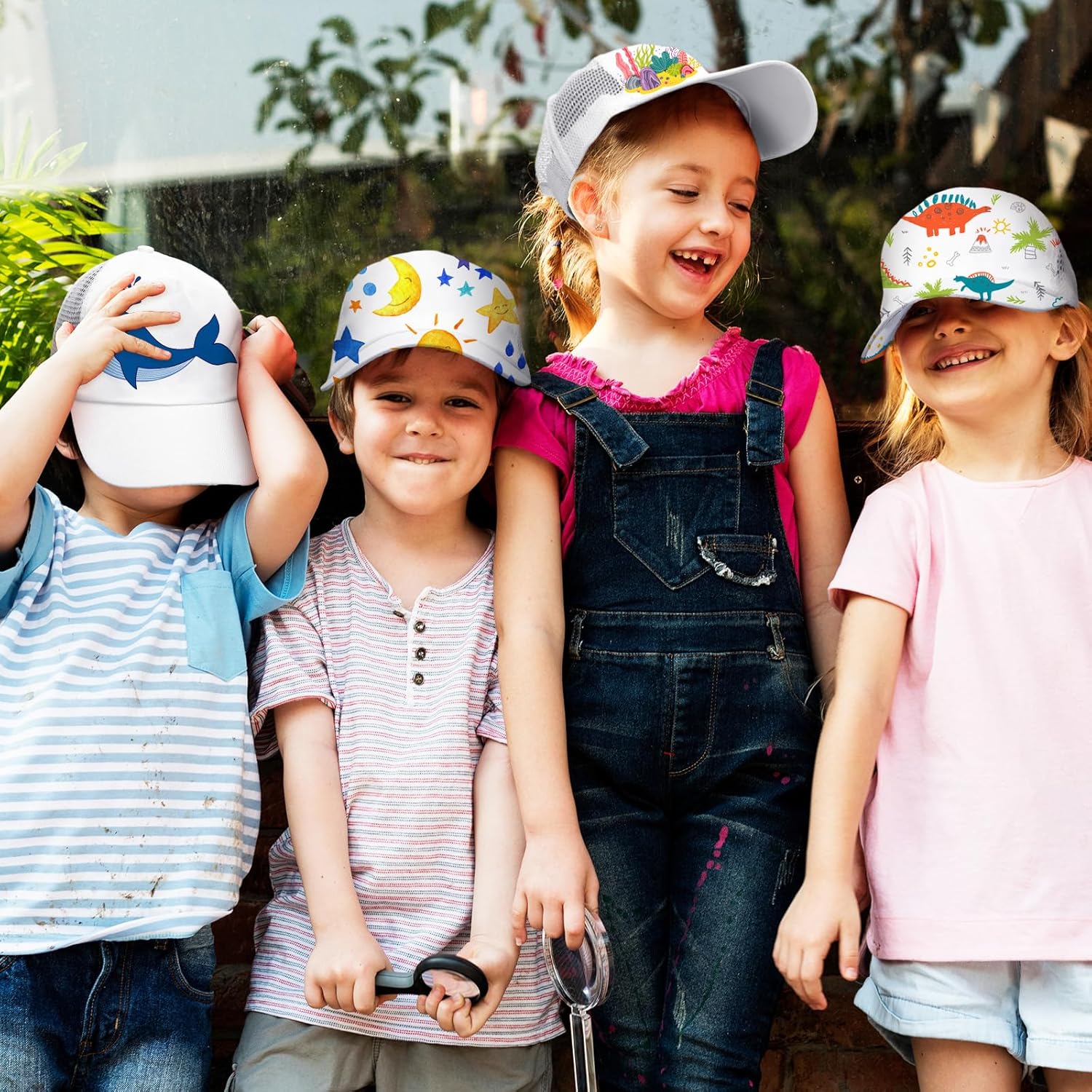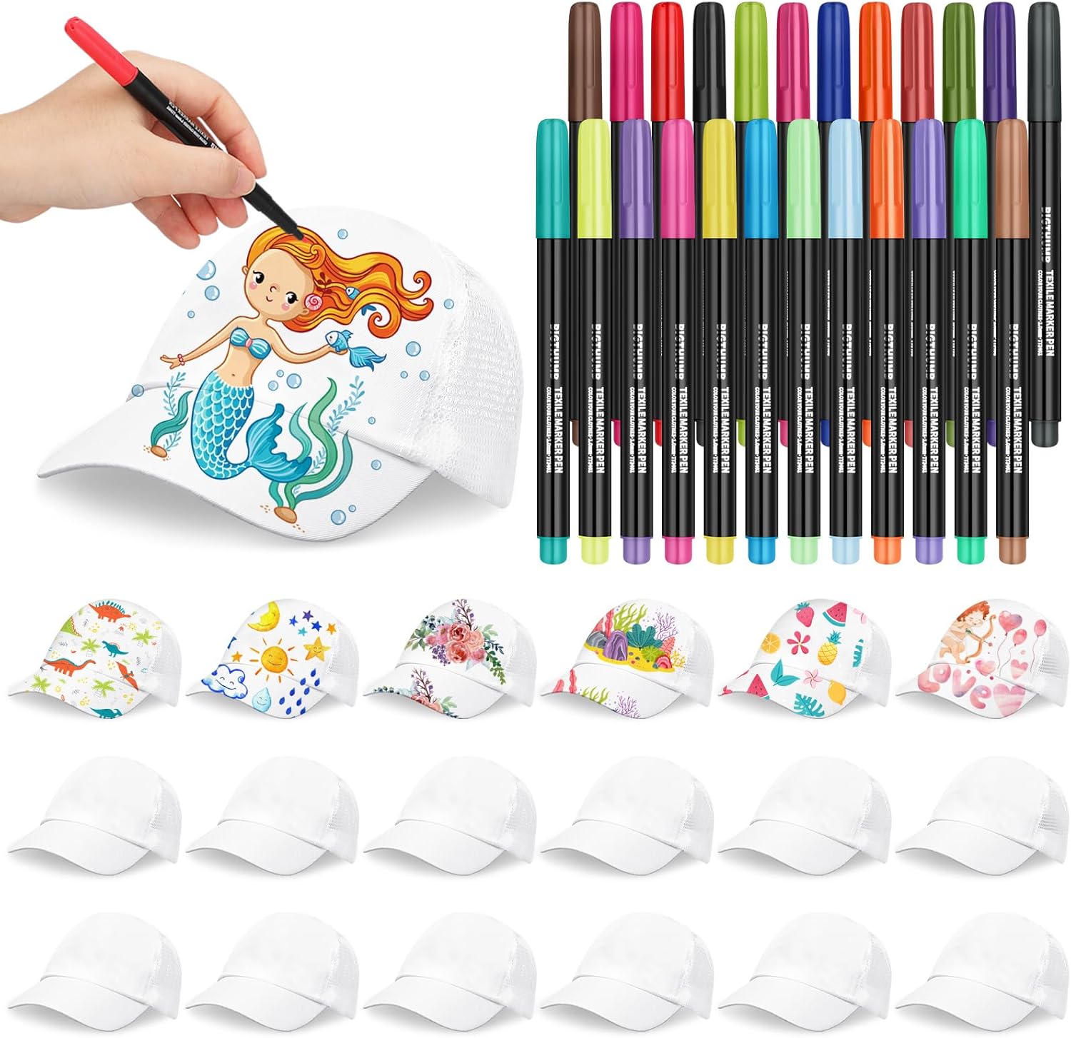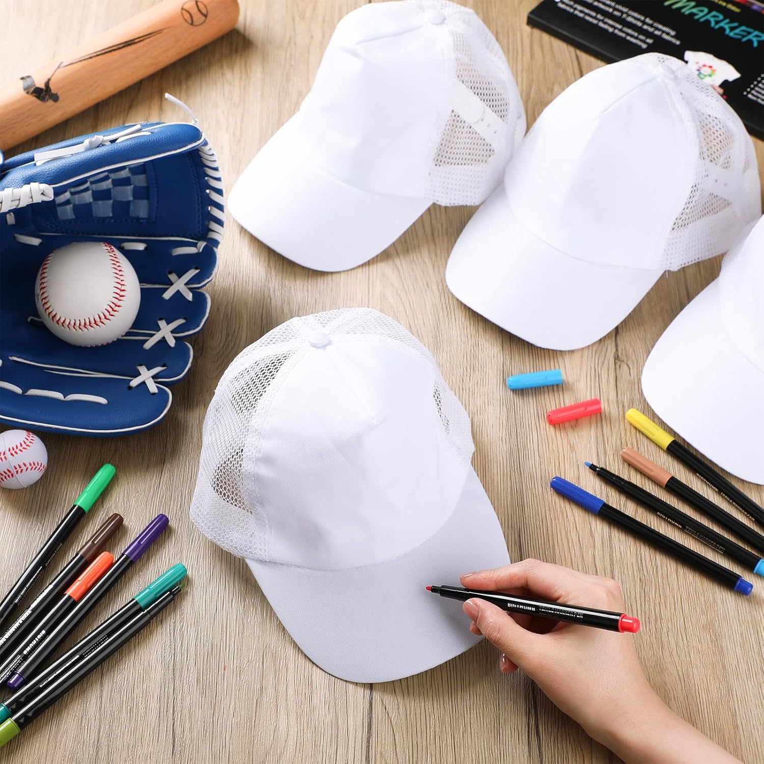 Funnysoftâs 16-piece white blank baseball caps are the ultimate way to unleash creativity. Paired with 24 vibrant fabric markers, these caps let kids and adults design their own unique looks. The adjustable back strap ensures a secure fit for children aged 2 to 8, while the breathable mesh keeps them comfortable during all-day play and outdoor fun. Made from durable polyester, these caps are built to last and withstand daily wear. Whether itâs a classroom project, birthday party, or just a fun craft time, these custom design hats offer endless opportunities for self-expression and artistic creativity.