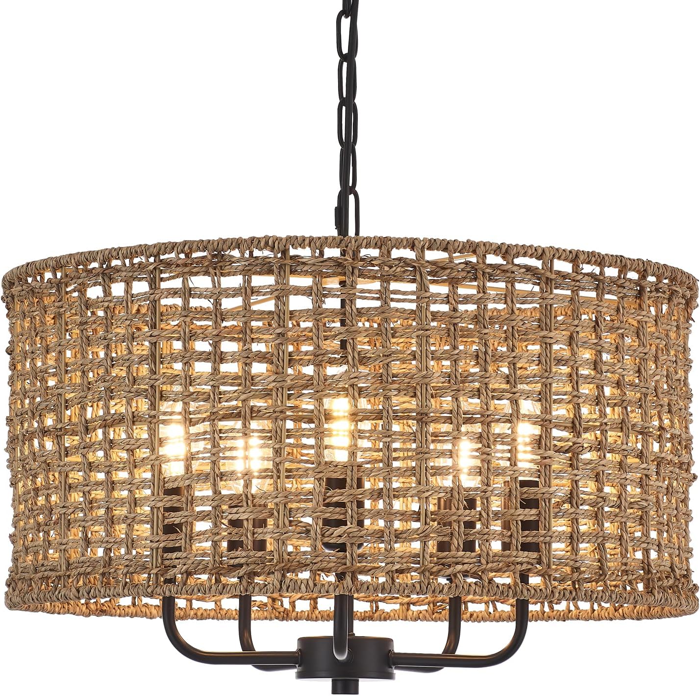 This hand-woven rattan chandelier is a perfect blend of rustic charm and contemporary lighting. The warm, inviting glow from its 5 light configuration creates a cozy atmosphere, while the golden metal frame adds a touch of timeless elegance. The chandelier's unique semicircular hollow cage design brings a boho-style aesthetic to your living or dining space, making it a standout piece of decor. Its adjustable hanging chain allows for customization to fit your roomâs height and style, ensuring a seamless look. Crafted with meticulous attention to detail, this chandelier is easy to install and comes with all the necessary hardware. Plus, itâs backed by a 1-year warranty, giving you confidence in your purchase. A versatile and stylish lighting solution for any home.Vintage Farmhouse Chandelier