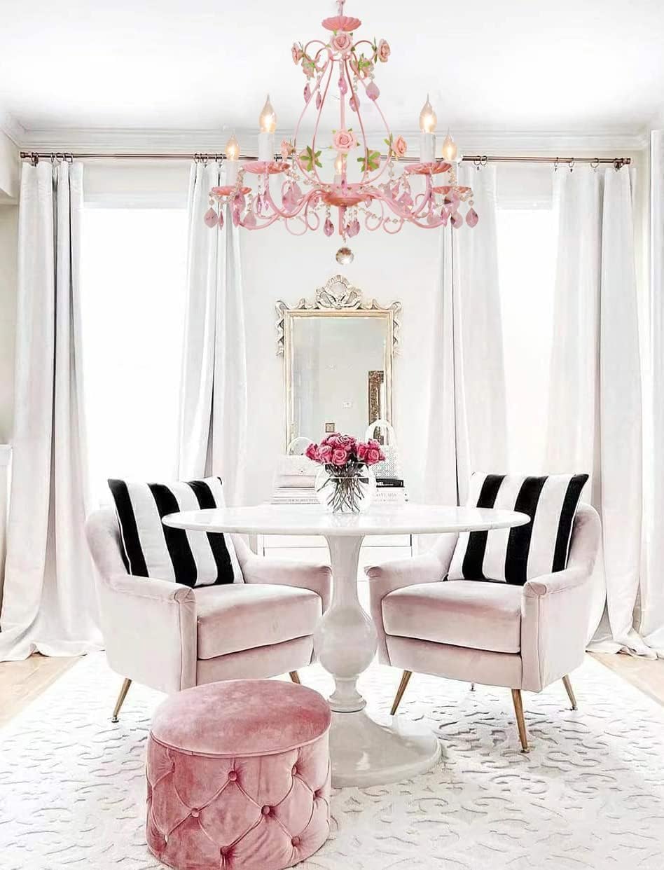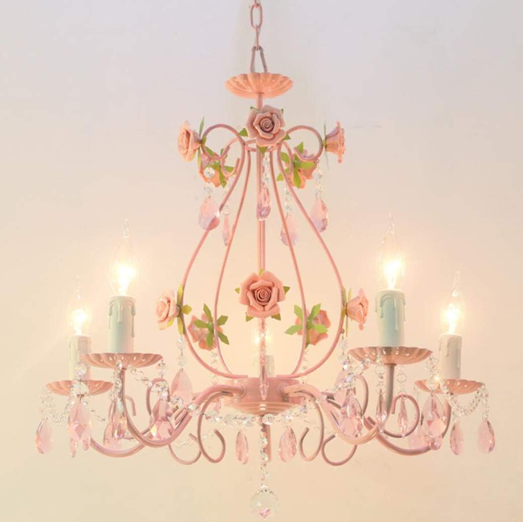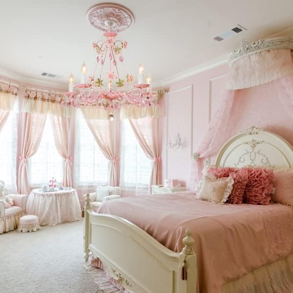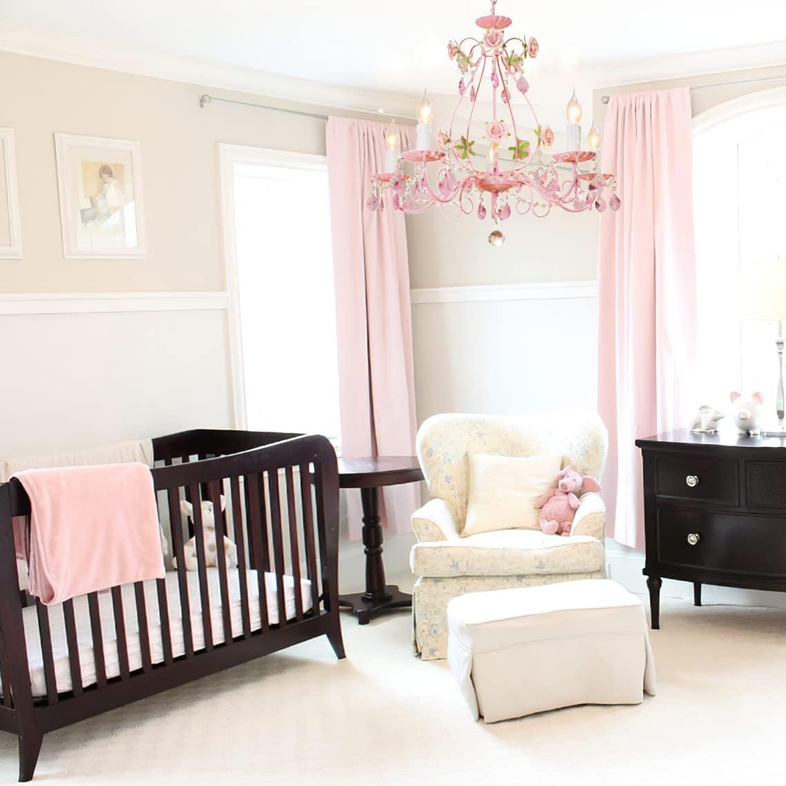Add a touch of enchantment and sophistication to your girlâs room or nursery with this stunning pink crystal chandelier. Its elegant 5-light design, inspired by a beautiful rose flower pattern, creates a warm and inviting glow that enhances your space. The adjustable hanging chain allows you to customize the height for perfect ceiling fit, making it ideal for both small and high-ceiling rooms.